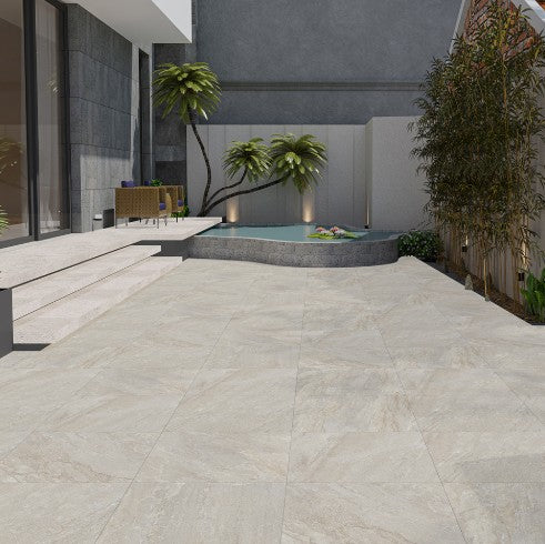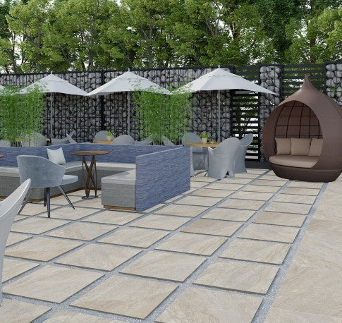 The Rastone Beige porcelain tile (60x90x2 cm) is ideal for outdoor paving. Its matt finish and precise edges offer a clean look, while the light grey tone adds subtle elegance. With five face variations, it ensures natural texture and long-lasting strength.