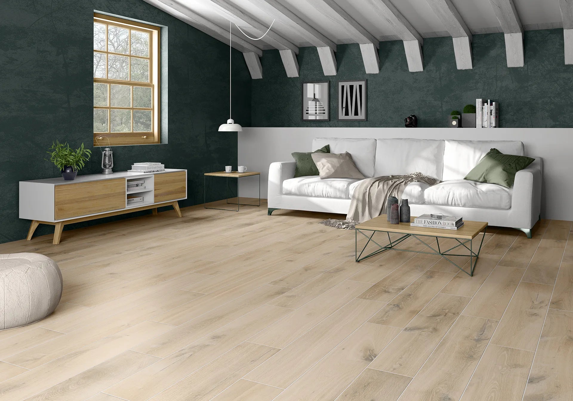 Matter Natural Wood is a wood-effect porcelain tile that combines the warm character of natural wood with the technical durability of porcelain stoneware. The rich tones and varied grain create a cosy yet contemporary look suitable for floors and feature walls. Porcelain is harder, denser and less porous than standard ceramic tiles, so it resists scratches, stains and moisture and is easy to maintain. This makes the tile ideal for busy kitchens, bathrooms and living areas.