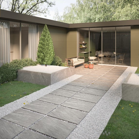 Kandla Grey porcelain tile (60x90x2 cm) is crafted specifically for outdoor paving applications. Featuring a matte surface and precise edges, it offers a refined appearance. The tile includes five distinct face variations, enhancing its natural texture and ensuring long-lasting strength.