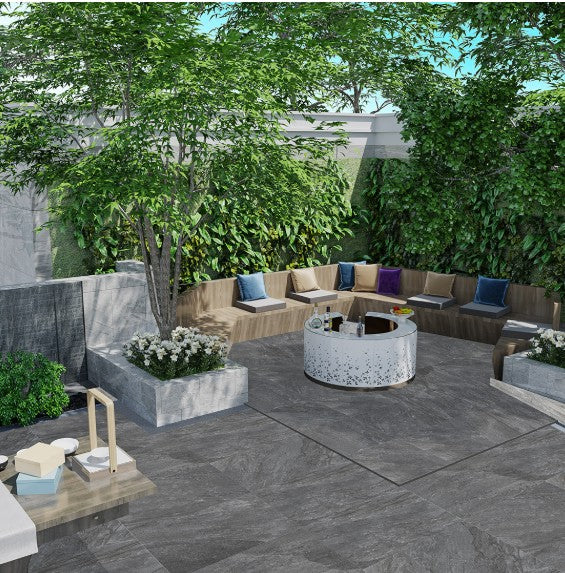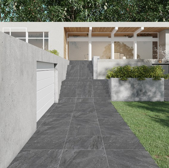 The Rastone Nero porcelain tile (60x90x2 cm) is designed for outdoor paving. Its matte finish and clean edges create a sleek look, while five face variations add natural texture and durability.
